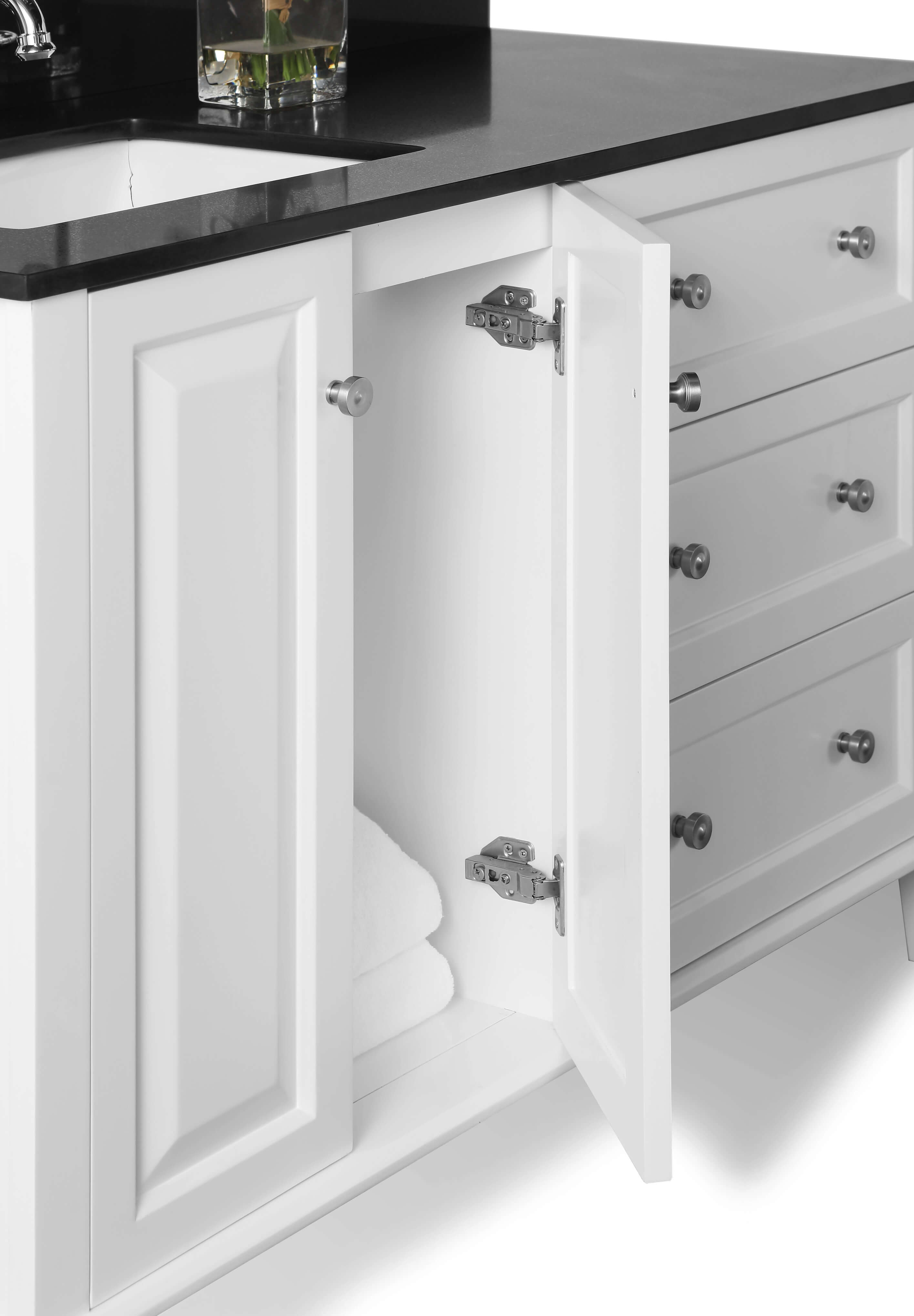 Left Basin | White Finish | Black Quartz Top | Brushed Nickel Hardware