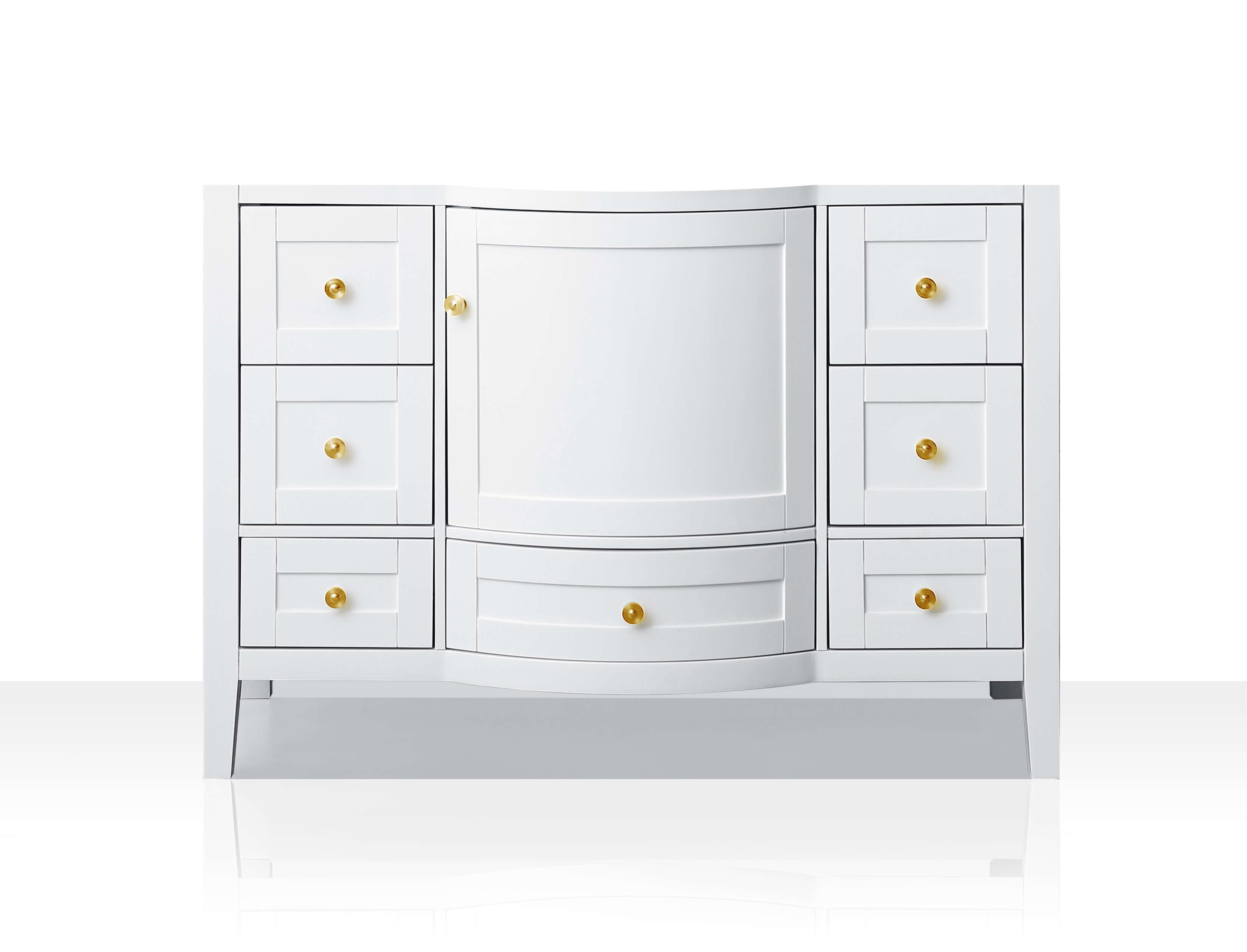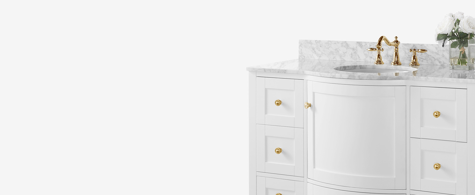 The Lauren Collection showcases Ancerre Designs’ skills in pushing curve tolerance to perfection. From selecting quality wood to using the most durable soft-close hardware, no details were overlooked in crafting the Lauren 48-inch vanity set. The vanity set includes a furniture-style cabinet, an imported Italian Carrara White marble countertop with a 4-inch backsplash, a wide oval undermount basin, solid wood drawer boxes, soft-close doors & drawers, and either brushed nickel or gold hardware. Complete the look with our mirrors which are sold separately (M-28-W).