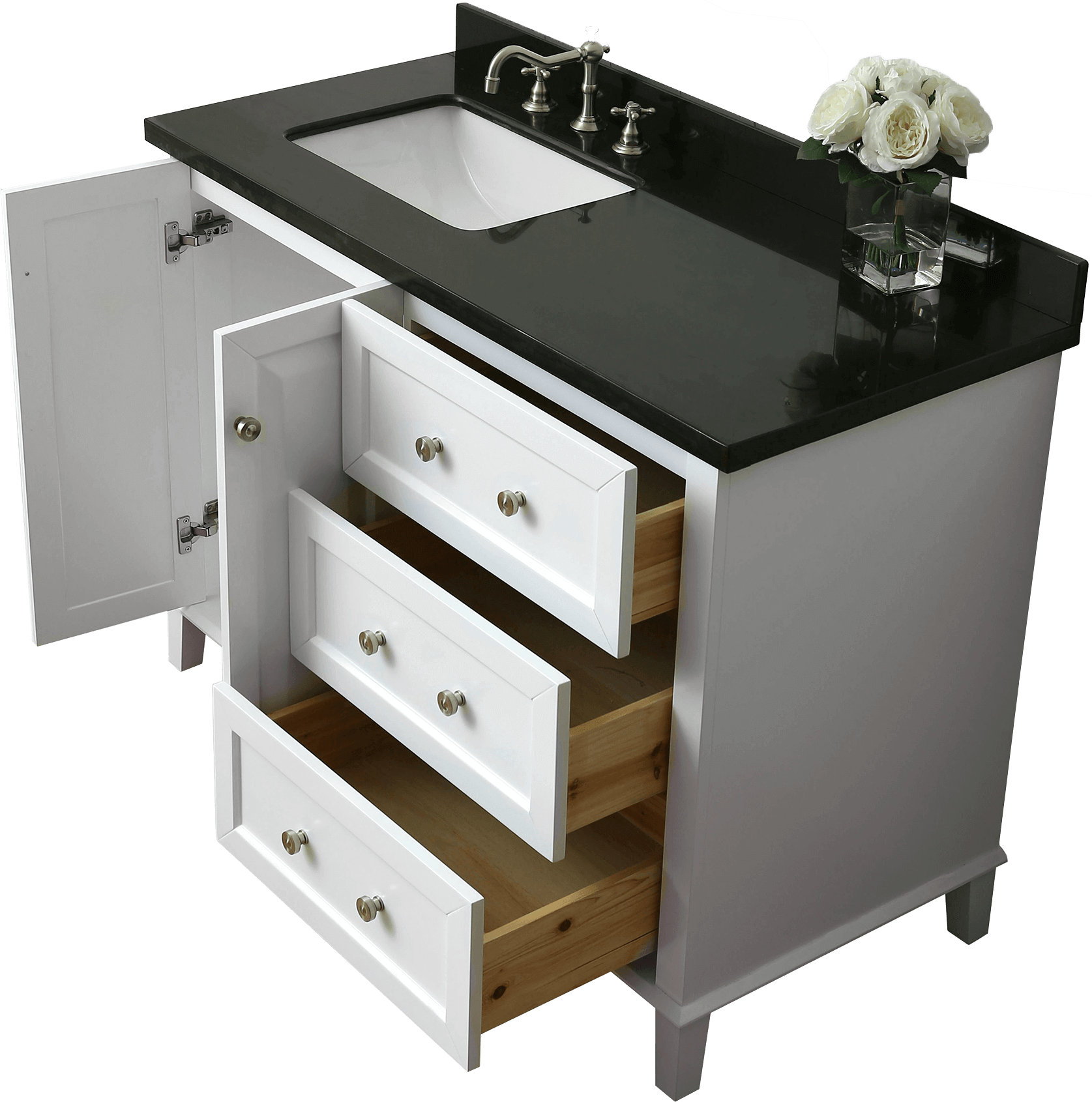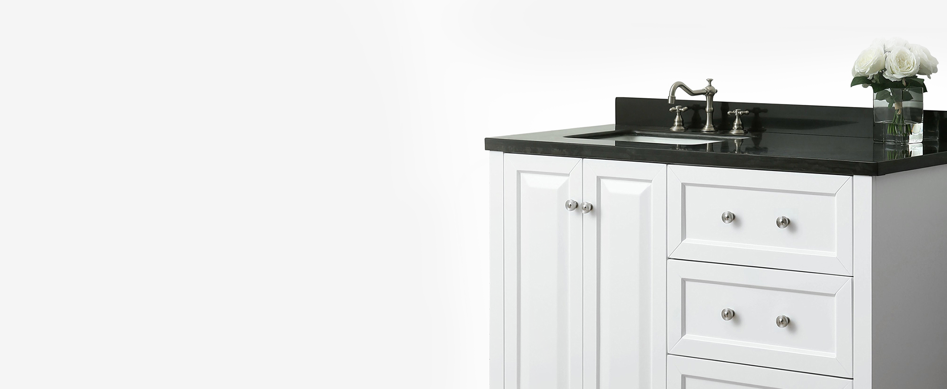 Left Basin | White Finish | Black Quartz Top | Brushed Nickel Hardware