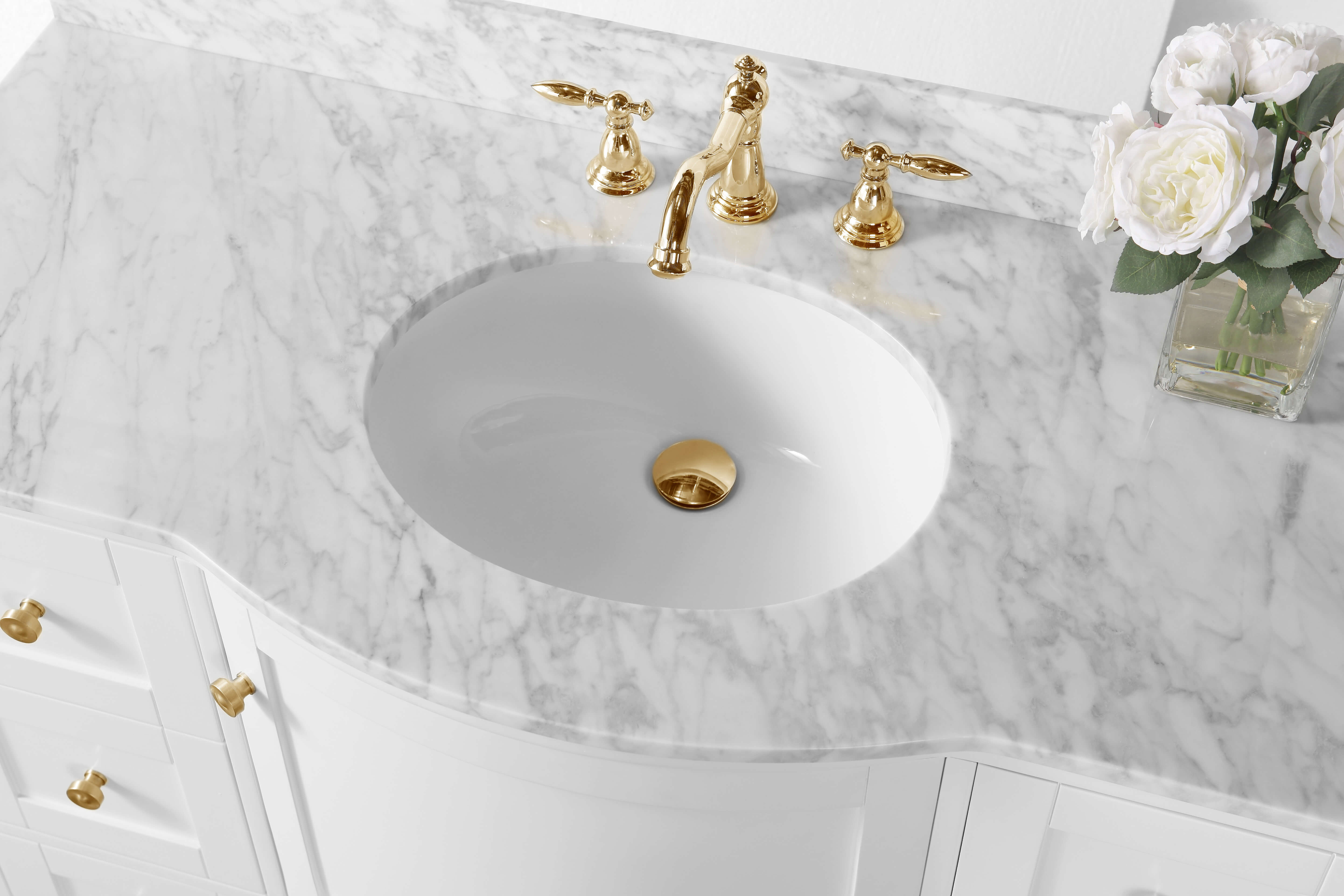 The Lauren Collection showcases Ancerre Designs’ skills in pushing curve tolerance to perfection. From selecting quality wood to using the most durable soft-close hardware, no details were overlooked in crafting the Lauren 48-inch vanity set. The vanity set includes a furniture-style cabinet, an imported Italian Carrara White marble countertop with a 4-inch backsplash, a wide oval undermount basin, solid wood drawer boxes, soft-close doors & drawers, and either brushed nickel or gold hardware. Complete the look with our mirrors which are sold separately (M-28-W).